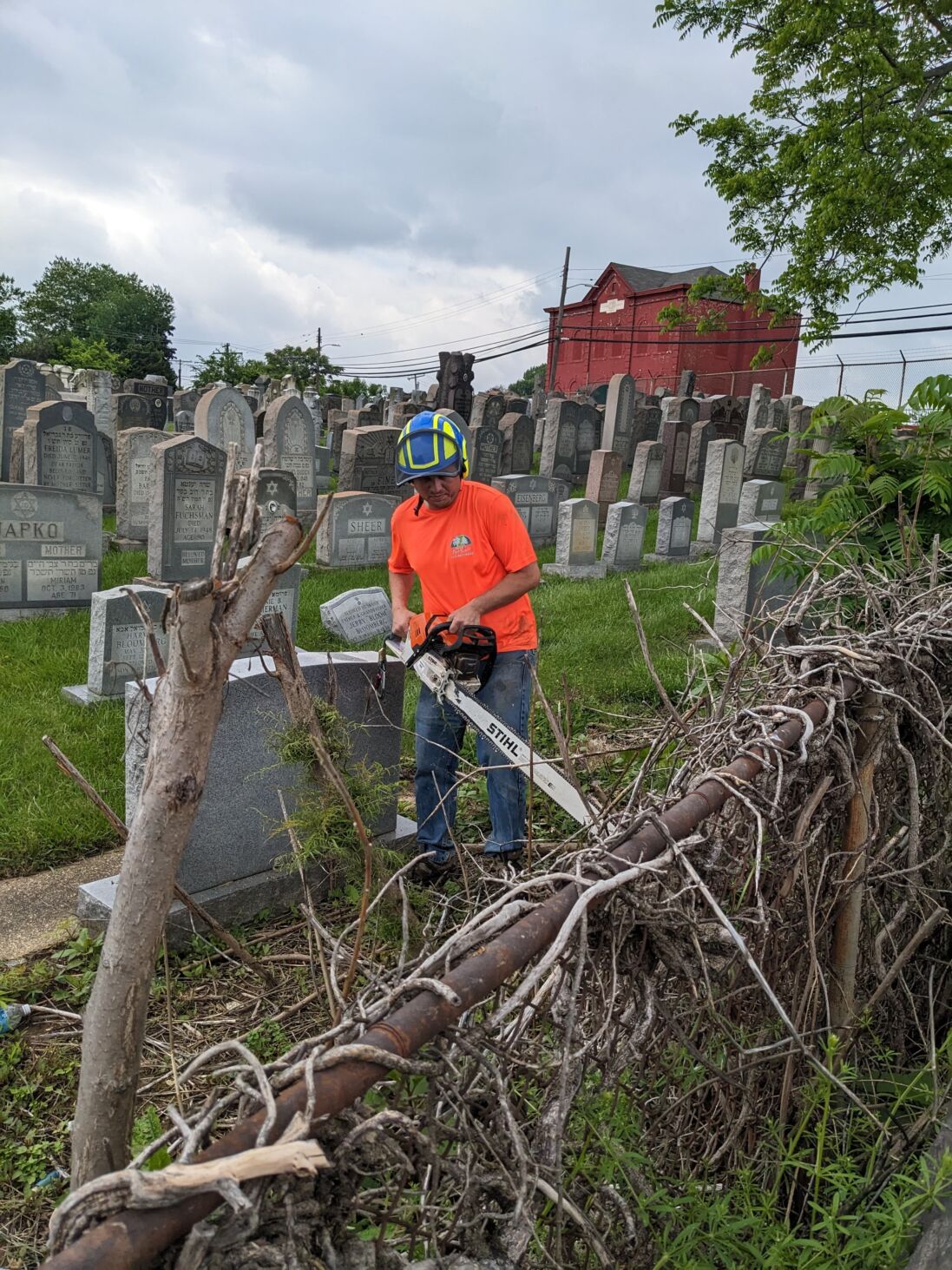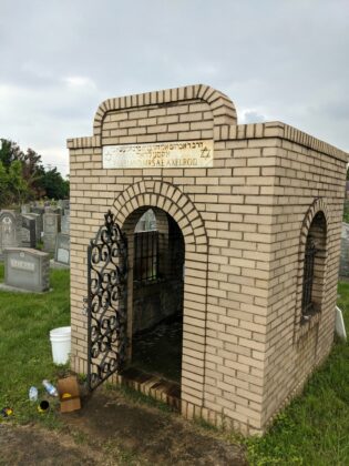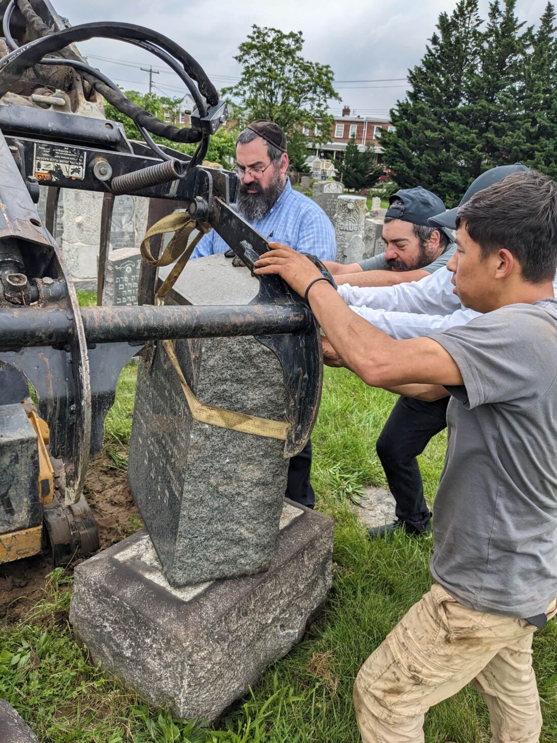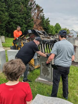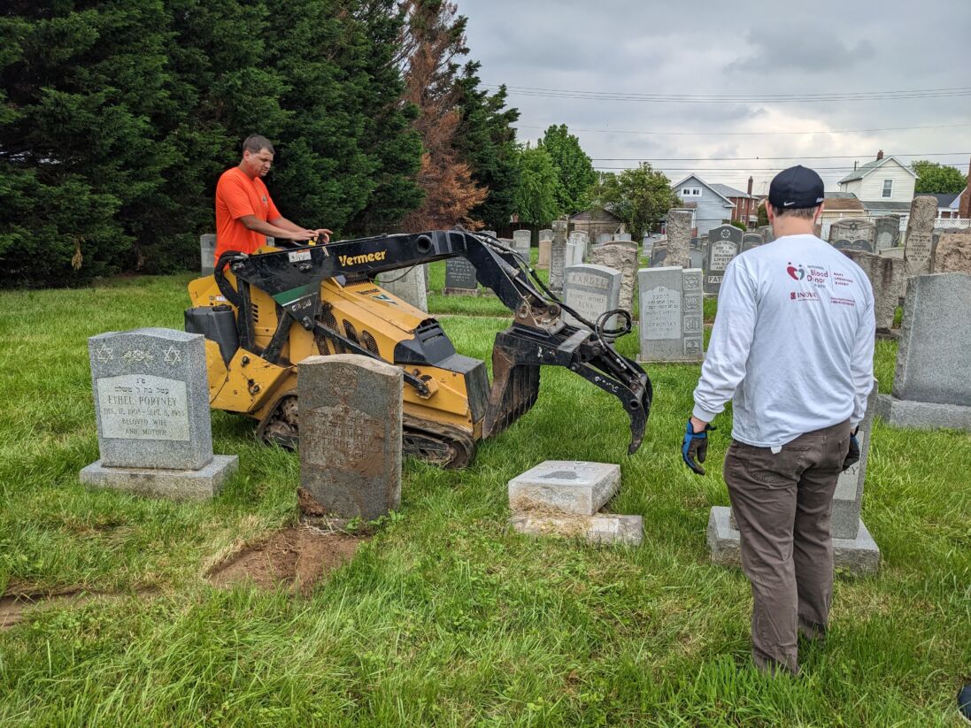 Steve Venick, executive director of the Jewish Cemetery Association, organized a tombstone cleaning and repair day at the Jewish cemeteries on German Hill Road in Dundalk. Pikesville Tree Service owner Levi Lowenstein donated his time and usage of his machinery to help lift the many fallen tombstones. Participants secured the granite bases, set the lifted stones and trimmed back overgrown trees and shrubs.