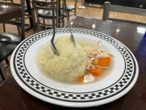 The thing you’ll immediately notice upon ordering a bowl of matzah ball soup at Mikey and Mel’s is the size of the matzah ball. It dwarfed the rest of the meat, vegetables and pasta floating in the broth, and I would estimate that the one that came in the bowl I tried was the size of a baseball.