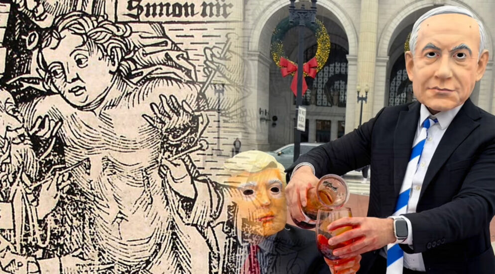Once again the medieval lie that Jews consume human blood has landed, this time at Washington, D.C.’s Union Station. In an outrageous piece of guerrilla art, masked “actors” portraying Prime Minister Benjamin Netanyahu recently toasted a Friendsgiving Dinner with “Gaza’s Spilled Blood” on the menu.