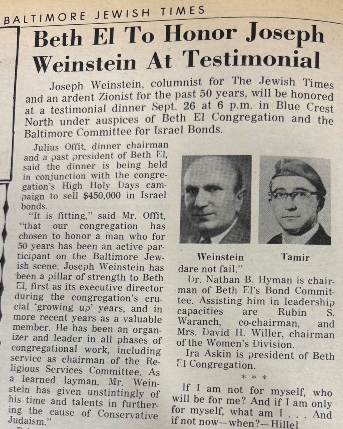 “‘It is fitting,’ said Mr. Offit, ‘that our congregation has chosen to honor a man who for 50 years has been an active participant on the Baltimore Jewish scene. Joseph Weinstein has been a pillar of strength to Beth El, first as its executive director during the congregation’s crucial ‘growing up’ years, and in more recent years as a valuable member,’” the article said.
