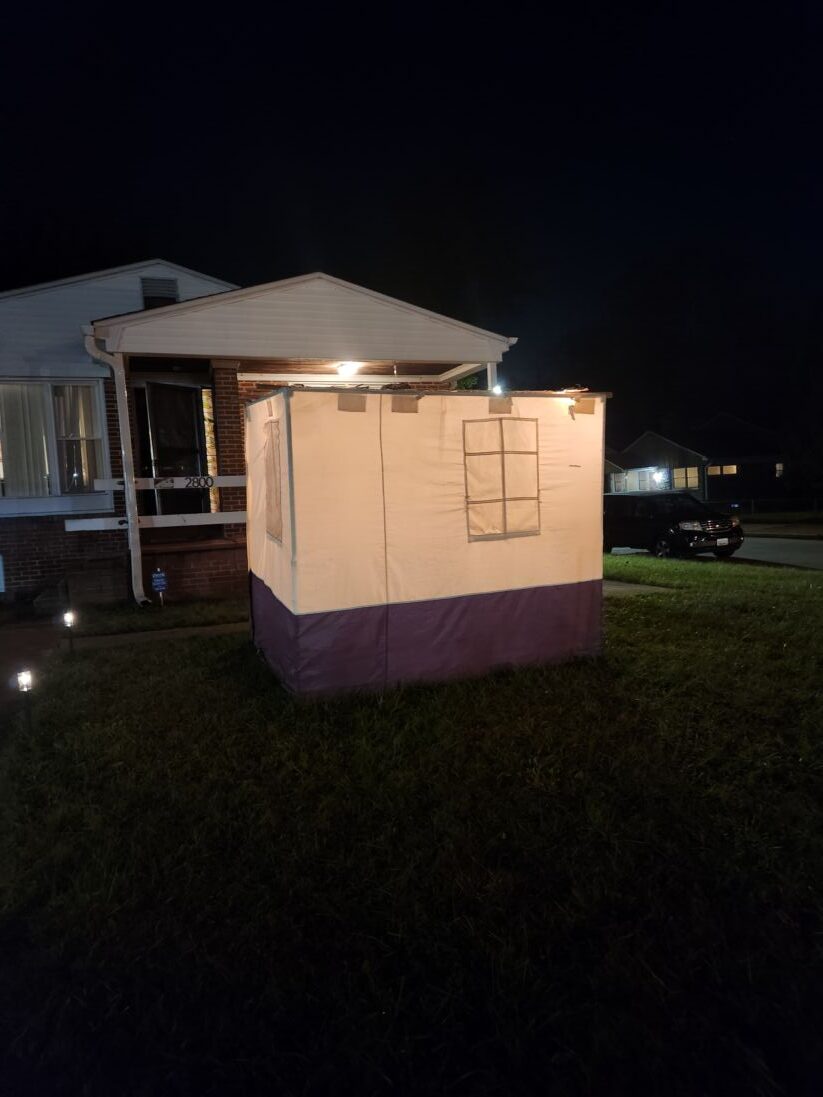 Another sukkah on the same block sits right in front of the house of Avi and Devorah. They love to have their children create decorations for their sukkah. One daughter enjoys making decorations out of colored straws. Their sukkah is filled with colorings of each of the Jewish historical figures that were given out in the Jewish school they attend.