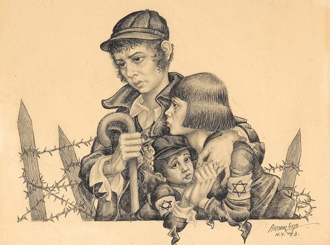 Szyk (1894-1951) was born in Łódź and trained as an artist in Kraków and Paris, absorbing medieval illumination, caricature and modern political satire. A formative visit to Palestine in 1914 sharpened his Zionist commitments, and the rise of fascism in Europe transformed his art into an explicit weapon against tyranny.